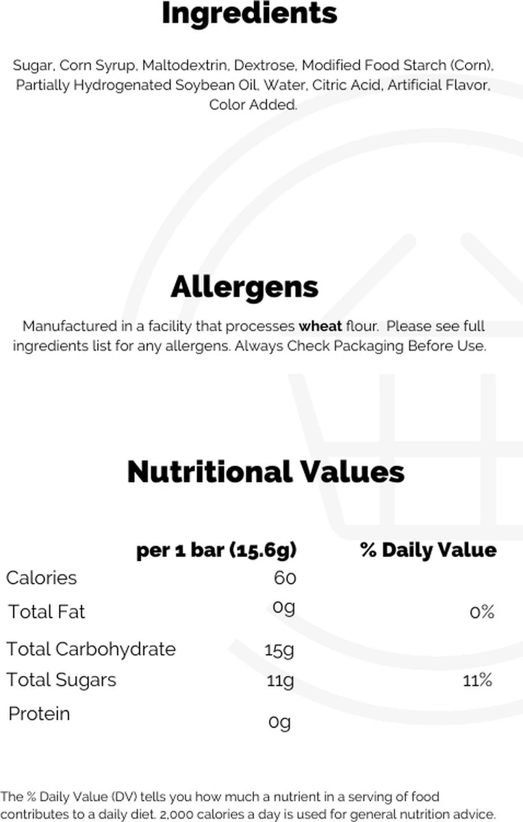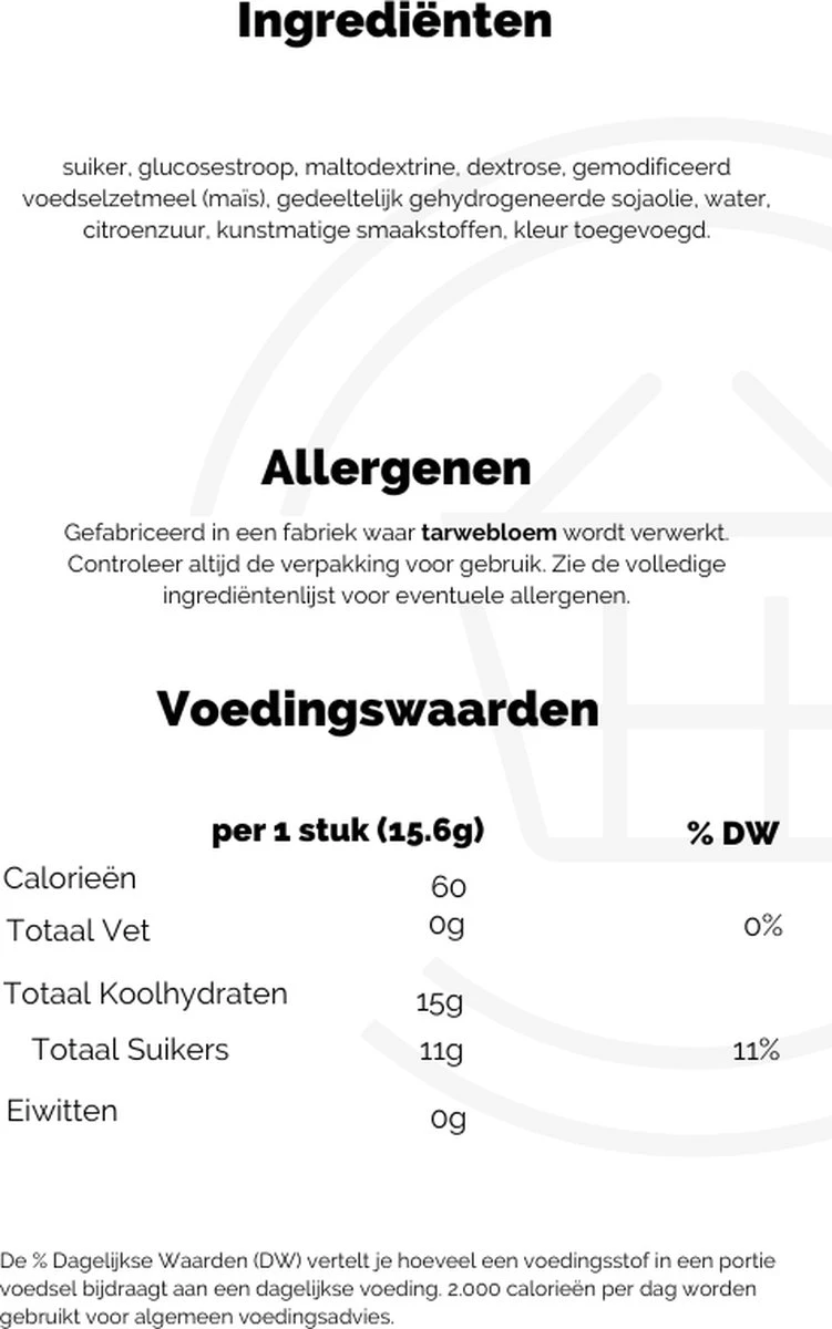 | Ingrediënten | suiker, glucosestroop, maltodextrine, dextrose, gemodificeerdvoedselzetmeel (maïs), palmolie, bevat minder dan (2%), :citroenzuur,water, kunstmatige aroma's, E129, E133, E110, E102. |