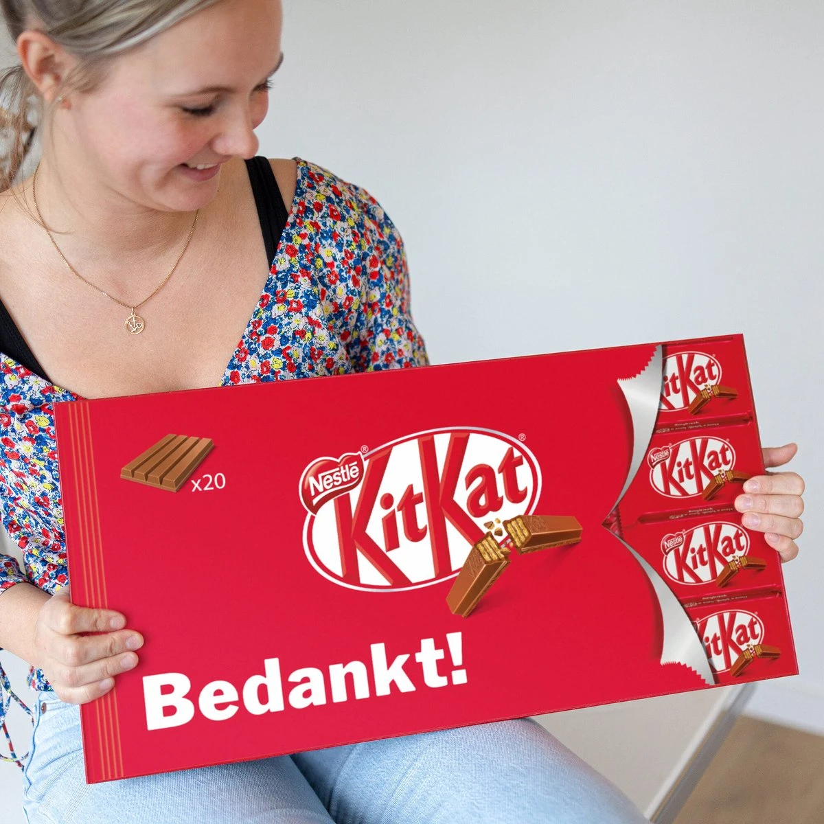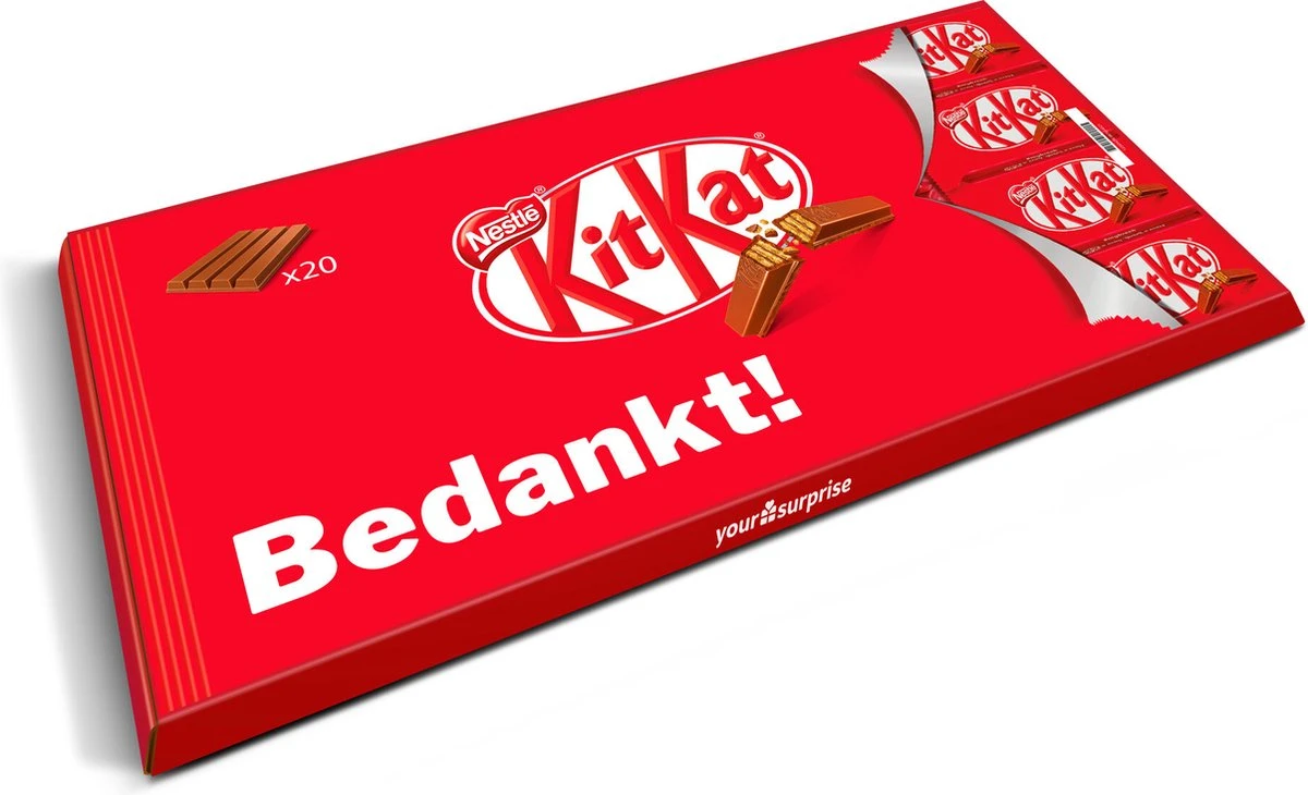Ken jij iemand die je heel graag wilt bedanken? Of ben jij blij met de hulp van je collega’s, omdat zij geholpen hebben om een belangrijke presentatie tot een goed einde hebben gebracht? Dan is deze Giant KitKat reep het perfecte cadeau! De ontvanger zal weten hoe MEGA blij je met hem of haar bent! De supergrote KitKat reep kun je natuurlijk ook voor jezelf bestellen, want hij is ook perfect om te delen met je familie, vrienden of wie jij maar wilt.