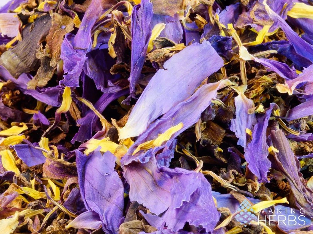 De Blauwe Lotus, Nymphaea caerulea, van Waking Herbs komt van biologische teelt in Thailand. We verkopen de hele bloemblaadjes, dus geen poeder of gesnipperde blaadjes.