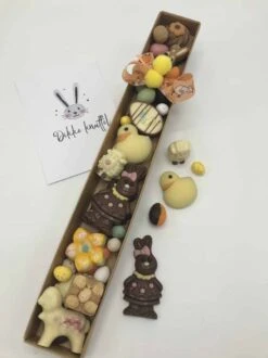 Een mooie langwerpige cadeaubox gevuld met ruim 250 gram mixed Paaschocolade. Vrolijke haasjes, kipjes, eitjes, eendjes en bloemen van lekkere chocolade in de smaken melk, wit, puur, aardbei, sinaasappel en karamel. Het is een combinatie van massieve chocolade en gevulde chocolade. Heerlijk! De box is gestrikt met mooi paaslint en je ontvangt er een leuke lente ansichtkaart bij. Een mooi, lekker en luxe cadeau voor de chocolade liefhebber.