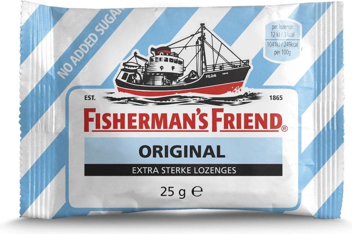 Fisherman s Friend Original Suikervrij 24 x 1ZK – Voordeelverpakking. Fisherman’s Friend Original zijn heerlijke pastilles met extra verfrissende smaak van menthol en eucalyptus, zonder toegevoegde suikers. Alle lozenges van Fisherman zijn te consumeren door vegetariërs, veganisten en moslims (halal) en zijn bovendien vrij van gluten. WaarschuwingenGebruik onder de 5 jaar wordt niet aangeraden. Overmatig gebruik kan een laxerend effect hebben. Bevat zoethout. Mensen met een hoge bloeddruk dienen overmatig gebruik te vermijden. Bevat sorbitol (91 g/100 g). Door temperatuurschommeling kan eventueel kristallisatie van menthol optreden, hetgeen de kwaliteit niet beïnvloedt. U ziet slechts kristalwolkjes. Verpakking goed dichtvouwen om verkleuring van het product door luchtvochtigheid te vermijden.