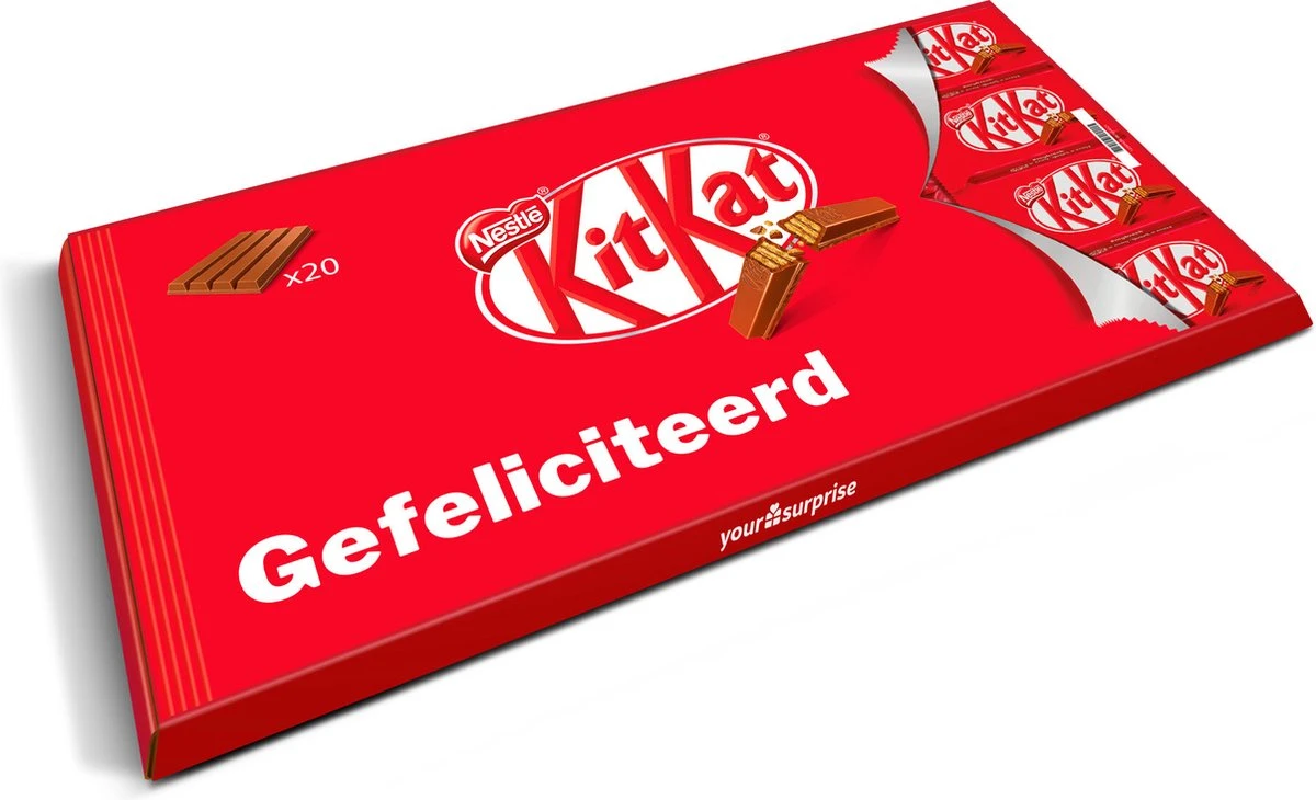 Heeft je broer eindelijk zijn rijbewijs gehaald en wil je hem feliciteren met zijn verjaardag? Of ben jij reuze trots op je collega’s, omdat zij die belangrijke presentatie tot een goed einde hebben gebracht? Dan is deze Giant KitKat reep het perfecte cadeau! De ontvanger zal weten hoe MEGA blij je met hem of haar bent! De supergrote KitKat reep kun je natuurlijk ook voor jezelf bestellen, want hij is ook perfect om te delen met je familie, vrienden of wie jij maar wilt.