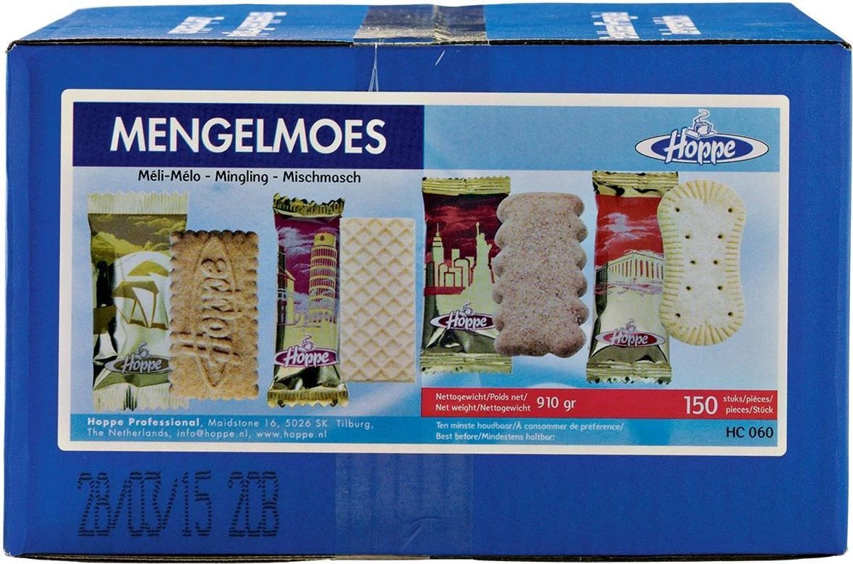 Hoppe mengelmoes koekjes, doos met 150 Hoppe koekjes in 4 verschillende soorten. De koekjes zijn prachtig verpakt met een wereldse uitstraling en per stuk verpakt, dus altijd lekker vers.