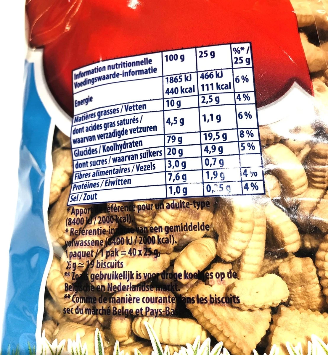 | Ingrediënten | Ingrediënten: TARWEBLOEM, suiker, palmolie, dextrose, volle MELKPOEDER, rijsmiddelen (natriumwaterstofcarbonaat, ammoniumwaterstofcarbonaat), zout, meelverbeteraar (NATRIUMMETABISULFIET), aroma. KAN EI, SOJA EN SESAM BEVATTEN. |