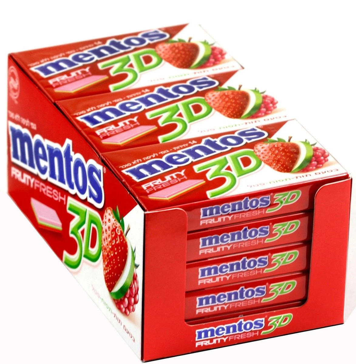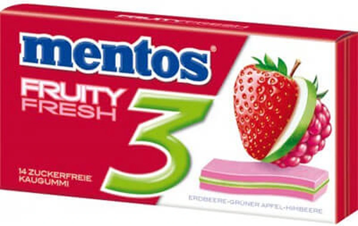 | Voedingswaarde | Mentos 3 layers has a textured gel middle layer which provides a unique soft chew and the 3 layers of chewing gum build on top of each other to release flavour. Mentos 3 Layers is available in Fresh mint and Fruit (strawberry-apple-raspberry) varieties. |