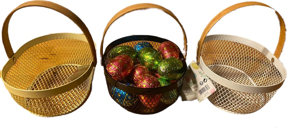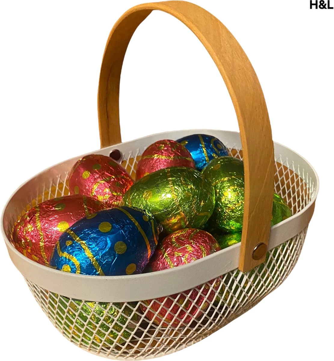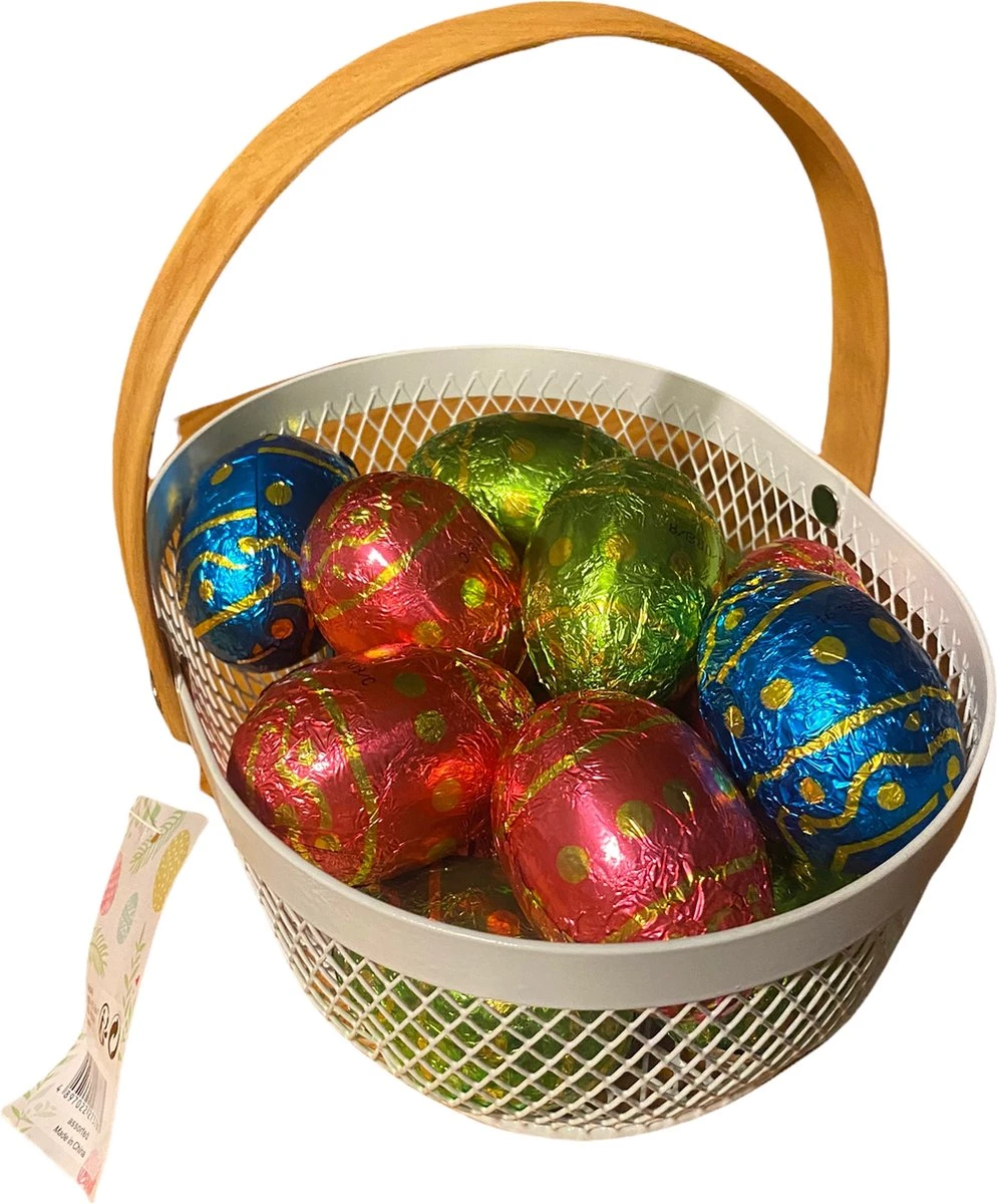 Metalen paasmand gevuld met chocolade verstopeieren ter grootte van een echt ei. Verstop deze leuke eieren van melkchocolade en laat de kinderen deze verzamelen in het paasmandje.