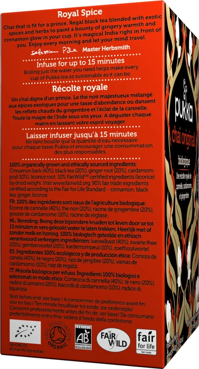 Pukka Original Chai is een blend met kaneel, zwarte thee, gember, kardemom en zoethout. Gemaakt van 100% biologische ingrediënten die duurzaam verbouwd zijn. Breng deze heerlijke kruiden tot leven door ze tot 15 minuten in vers gekookt water te laten trekken. Een doosje bevat 20 individueel verpakte theezakjes die volledig biologisch afbreekbaar zijn.