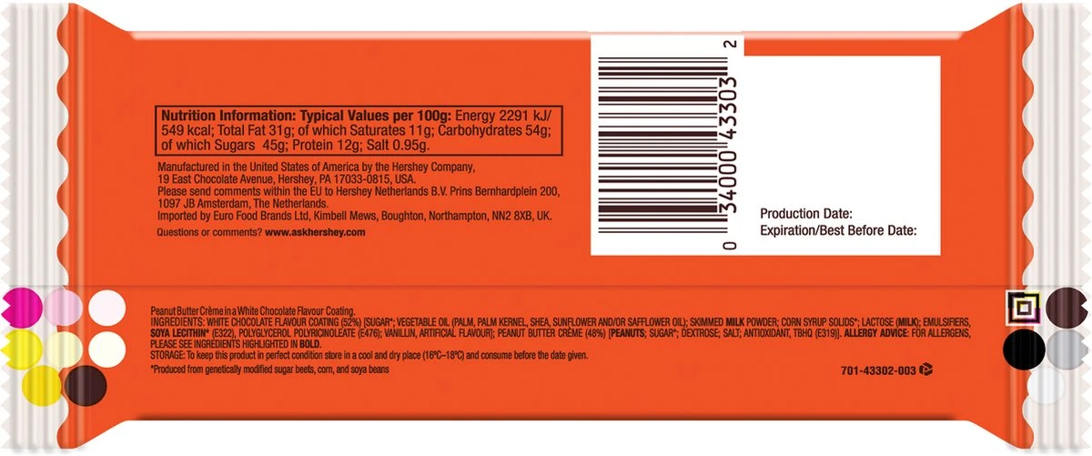 | Ingrediënten | Suiker, Plantaardige olie (palmolie, shea-olie, zonnebloemolie, palmpitolie, saffloerolie), Magere melk, dextrose, Vaste stoffen van maïssiroop, Lactose Bevat 2% of minder van: Zout, Lecithine, TBHQ, Citroenzuur, Vanilline, Tocoferolen PGPR |