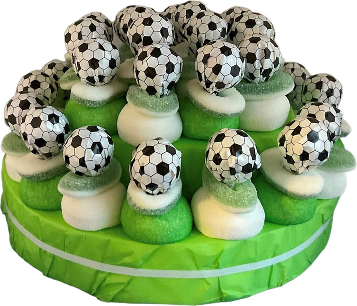 Deze snoeptaart Voetbaltaart Groen is een geschikt uitdeelcadeau voor een kinderfeestje, voetbalfeestje of voor een leuke traktatie op school. Op de snoeptaart Voetbal Groen staan 30 “voetbaltraktaties” (lolly, spekbol en appel-ring).